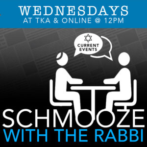 TKA’s weekly lunchtime schmooze. Join us in person or online via Zoom for our Wednesday get-together hosted by the one-and-only Rabbi Schneider!